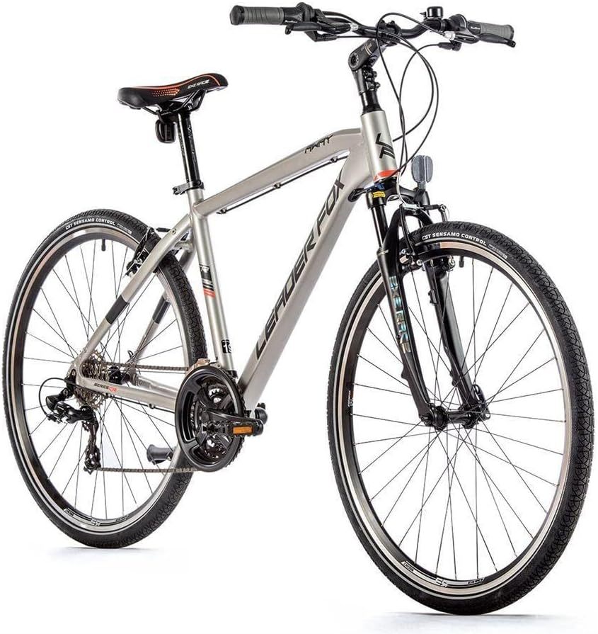 Leaderfox Away Gent - Bicicletta da cross da uomo con telaio in alluminio, geometria a diamante, altezza telaio: 48 cm, colore: argento. Dispone di deragliatore a 21 marce con Shimano Tourney posteriore. La forcella ammortizzata Zoom è dotata di blocco e ha una corsa di 45 mm. Dotata di freni meccanici a cerchione di Tektro e manubrio MTB Low Riser. Pneumatico da cross CST Control Plus Eco da 28", larghezza 40 mm, con supporto e campanello.